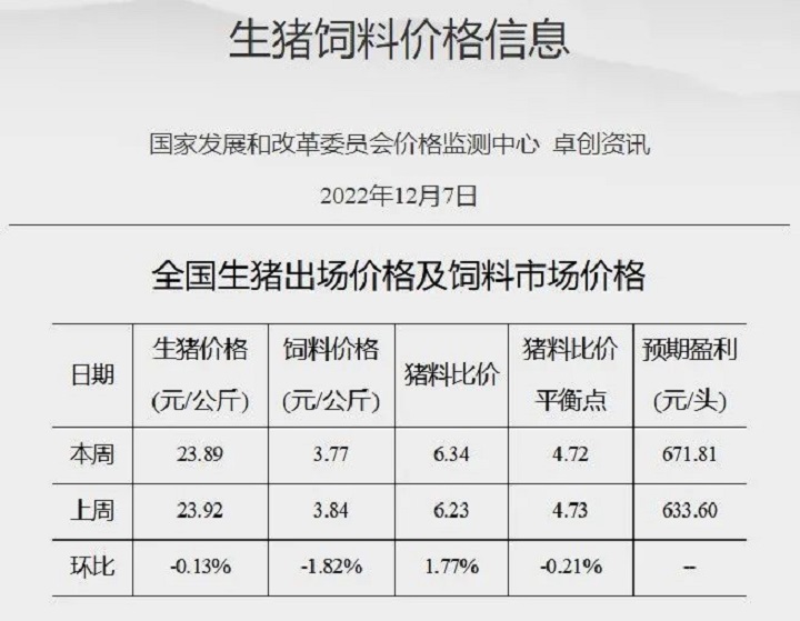 國(guó)家發(fā)展和改革委員會(huì)價(jià)格監(jiān)測(cè)中心監(jiān)測(cè),2022年12月第1周全國(guó)豬料比價(jià)為6.34,環(huán)比上漲1.77%。按目前價(jià)格及成本推算,未來生豬養(yǎng)殖頭均盈利為671.81元。本周國(guó)內(nèi)豬價(jià)呈先漲后跌走勢(shì)。