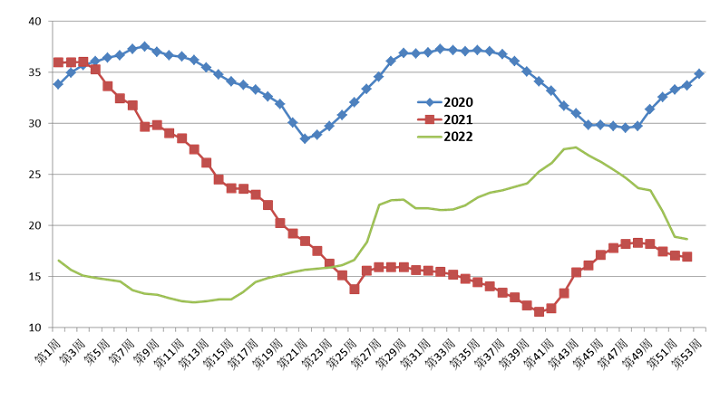 2020-2022年生豬周價(jià)格走勢(元/公斤)