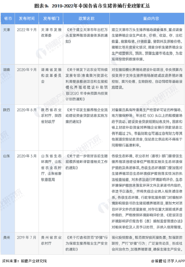 2019-2022年,天津、湖南、陜西、山東等部分省市也發(fā)布了生豬養(yǎng)殖行業(yè)政策,主要涉及資金貸款補(bǔ)貼、生態(tài)環(huán)境保護(hù)、打擊防范“炒豬”行為等。