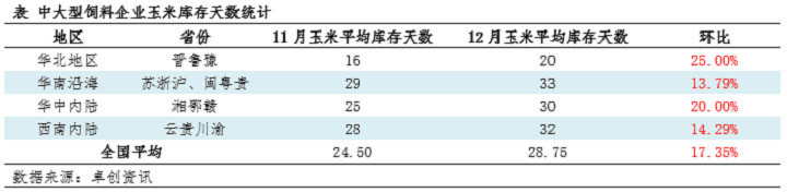 截至12月底,中大型飼料企業(yè)玉米庫存均有增加,且多數(shù)庫存在1個月以上。進入1月份,南方飼料企業(yè)備貨基本收尾,以訂單合同為主,高價現(xiàn)貨簽單意向不高。且生豬價格持續(xù)低迷,終端養(yǎng)殖利潤在盈虧線浮沉,春節(jié)前銷區(qū)玉米購銷偏淡,玉米價格實質(zhì)性上行空間或偏窄。