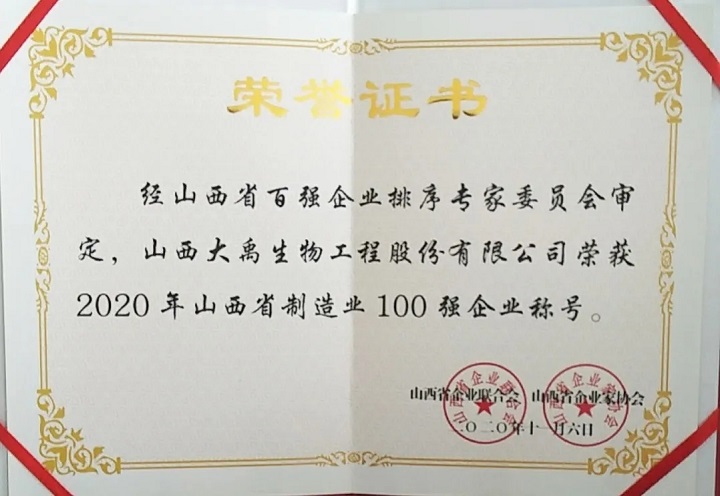 大禹生物榮獲山西省制造行業(yè)100強(qiáng)榮譽(yù)稱號(hào)。
