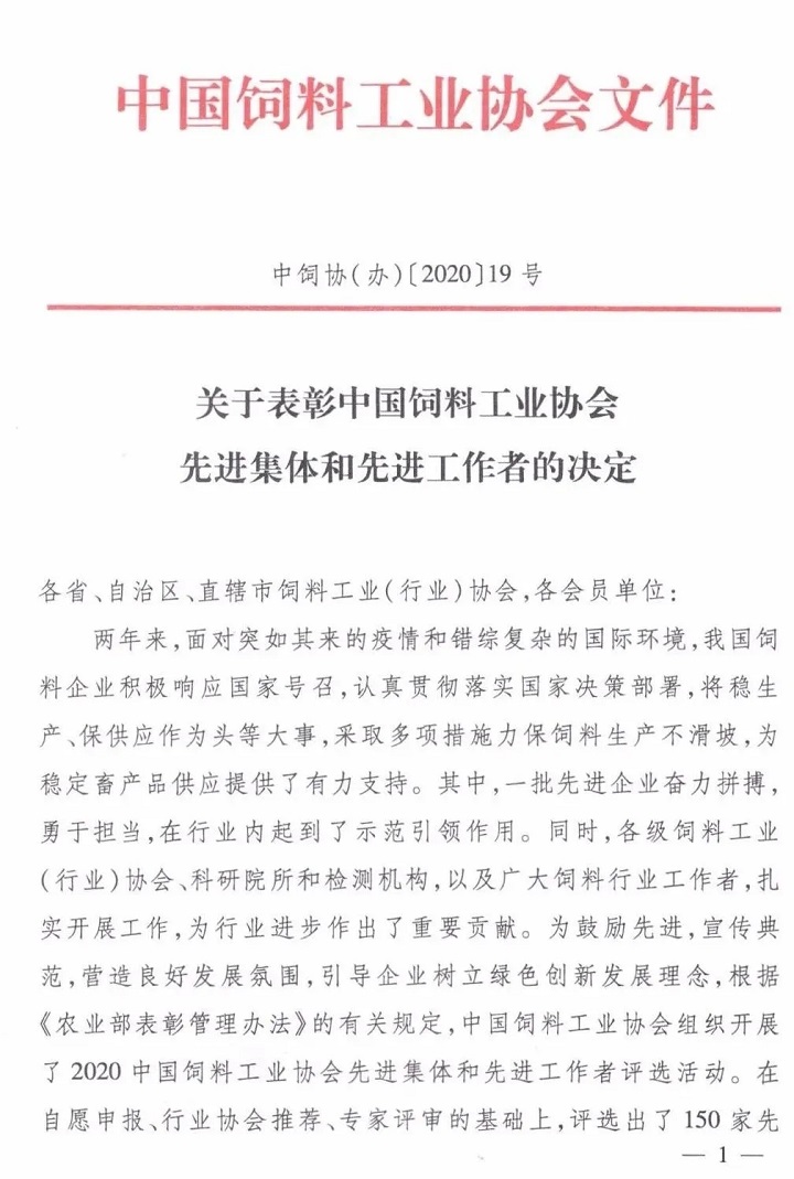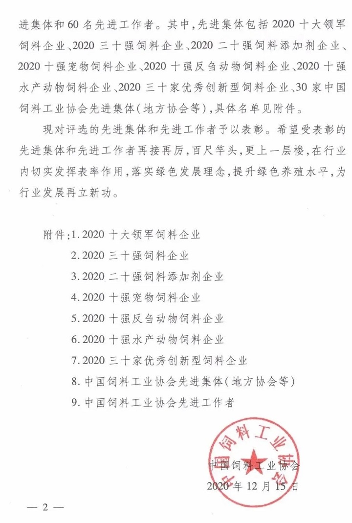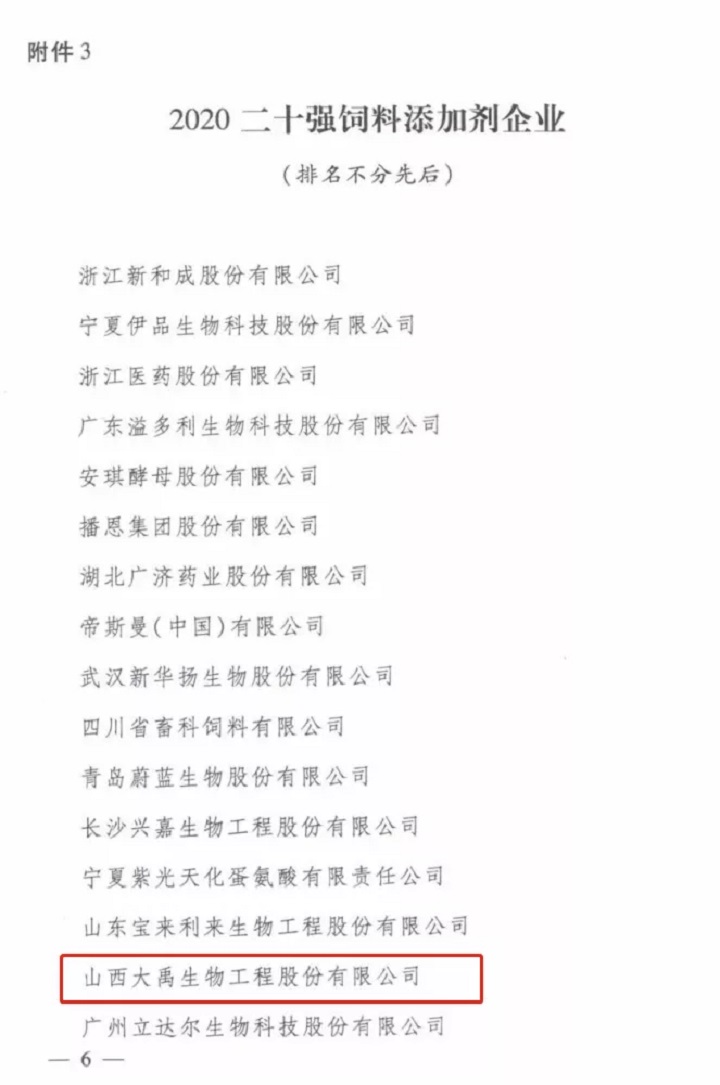 【喜訊】大禹生物榮獲2020全國(guó)二十強(qiáng)飼料添加劑企業(yè)稱(chēng)號(hào)